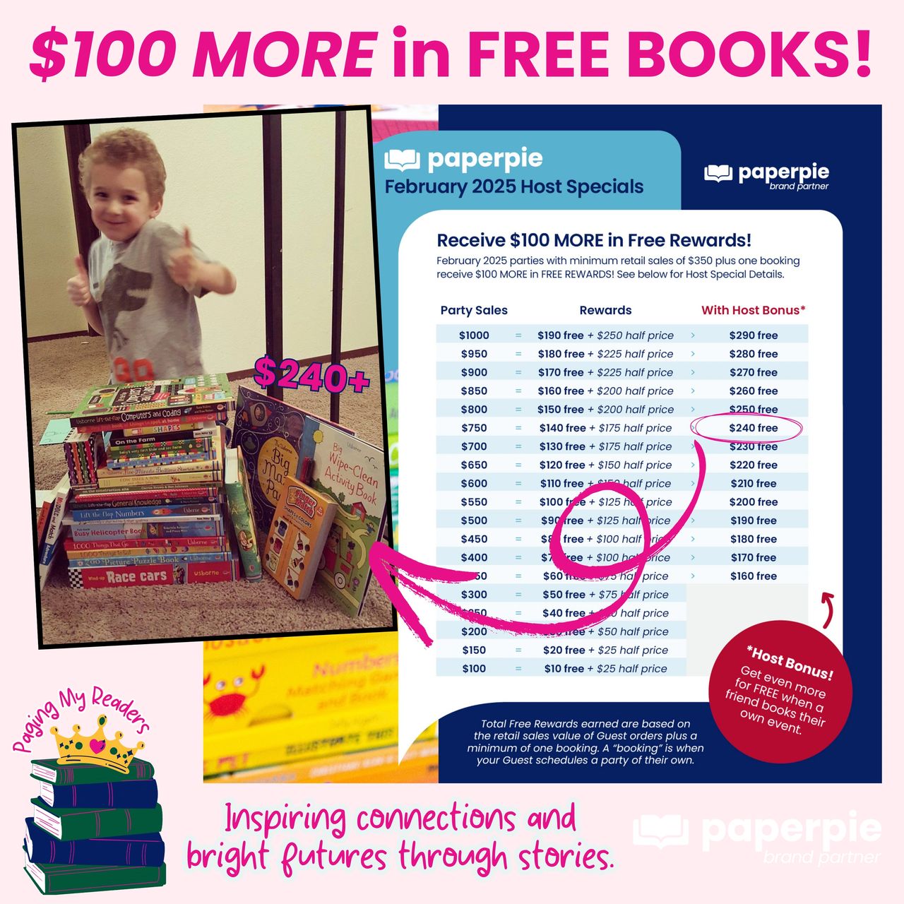 Hosting a book party is always rewarding, but this month, youâll get $100 MORE in free books when your party reaches $400+ in sales! That means even more adventure, learning, and laughterfor your family and friends!đđ