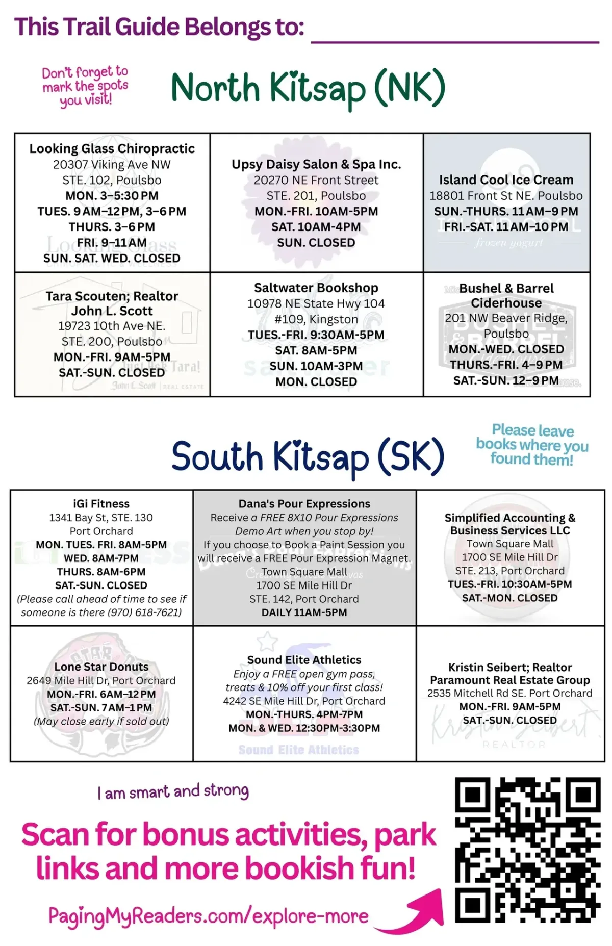 We’re so grateful for their partnership and support. Please take a moment to learn more about each one—and when you visit, let them know you're there because of the Kitsap County Reading Trail! 📚💛