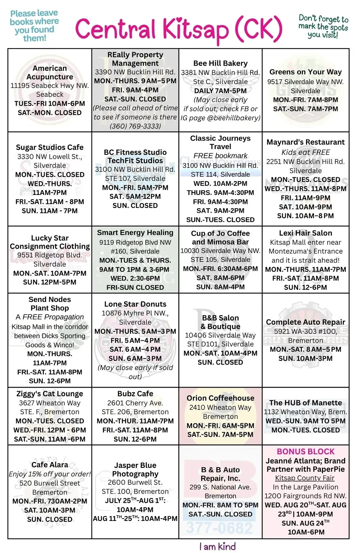 Each sponsor not only provided a special stop along the trail—but also helped bring the joy of reading, connection, and exploration to families all across our community. From cozy cafes to fitness studios, salons to bookstores, these businesses are committed to making Kitsap a more curious, connected, and kid-friendly place.